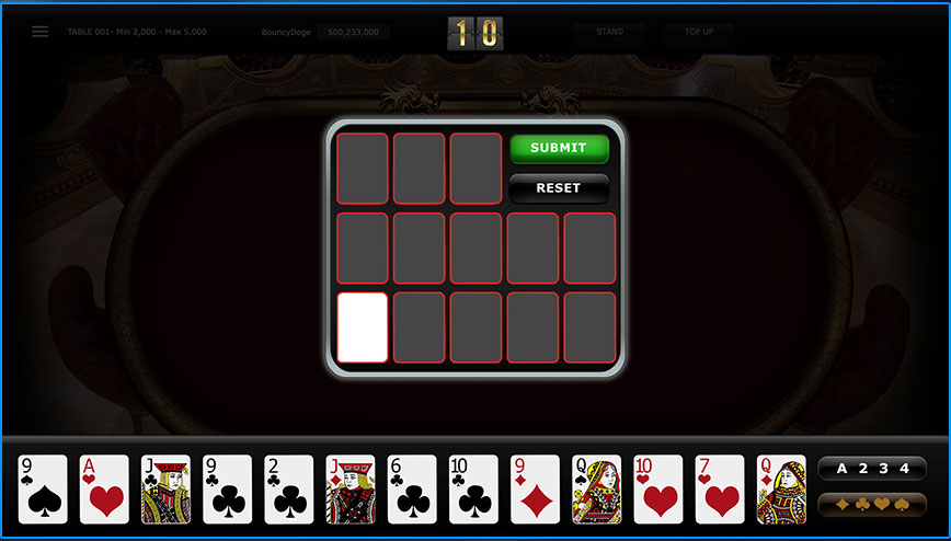 Setelah masing-masing pemain diberi dua kartu, para pemain diberi kesempatan untuk mengintip kartu mereka masing-masing. Setelah waktu mengintip selesai, para pemain harus menunjukkan kartunya di atas meja.