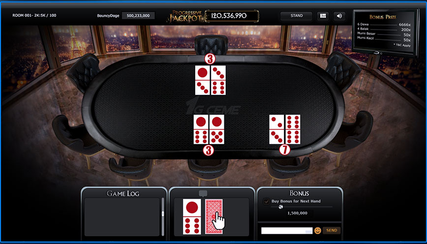 Kartu-kartu spesial yang ditampilkan ini merupakan kartu-kartu terbaik dalam permainan domino dan pemain yang mendapatkan kartu-kartu ini juga akan memenangkan jackpot. Jackpot yang didapatkan sesuai dengan pembelian jackpot dan hadiahnya. Anda dapat melihat peraturan dan hadiah jackpot pada menu jackpot.
