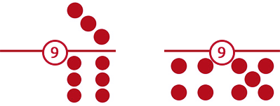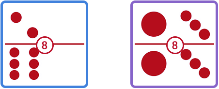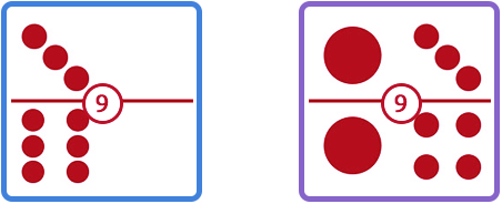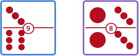 Dalam permainan ini nilai kartu anda disebutkan dengan cara Sisi Kiri : Sisi Kanan. Lihat contoh berikut untuk details, angka dalam lingkaran putih merepresentasikan nilai kedua kartu sisi kiri dan kanan.