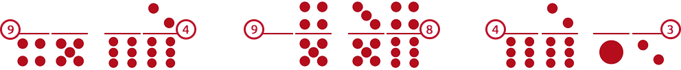 Perlu diingat bahwa nilai tertinggi dalam penghitungan ini adalah 9, jika jumlah titik lebih besar dari 10, 20, atau 30, maka angka yang diambil adalah digit terakhir hasil penjumlahannya. Berikut contoh cara menghitung kartu-kartu domino: