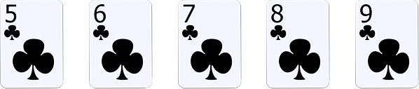 Straight Flush: Lima kartu dengan angka yang berurutan, semuanya memiliki suit yang sama.