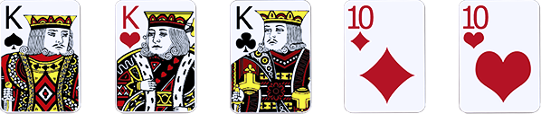Full House: Tiga kartu berperingkat sama, dan dua kartu berperingkat sama dari peringkat yang lain.