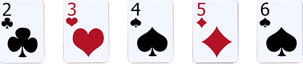 Catatan: Ace bisa digunakan sebagai puncak atau dasar urutan, dan merupakan satu-satunya kartu yang bisa digunakan demikian. A, K, Q, J, dan Sepuluh adalah straight tertinggi (Ace high); 5,4,3,2,A adalah straight terendah (Five high).