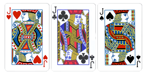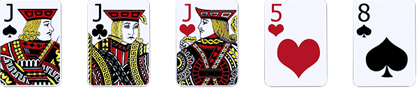 Terdiri dari kombinasi kartu King, Queen atau Jack, dengan simbol kembang bebas (hati, wajik, diamond, kriting)