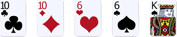 Two pair: Dua kartu berperingkat sama, dua kartu berperingkat sama dari peringkat yang lain, dan satu kartu sampingan.