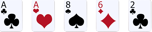 One pair: Dua kartu berperingkat sama, dan tiga kartu sampingan yang tidak terkait.